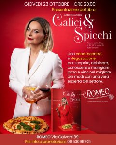 Il ristorante Romeo, nel cuore del quartiere Testaccio, ospiterà la presentazione del nuovo libro di Antonella Amodio, Calici & Spicchi – Atlante mondiale della pizza e del vino in 100 abbinamenti, edito da Malvarosa.