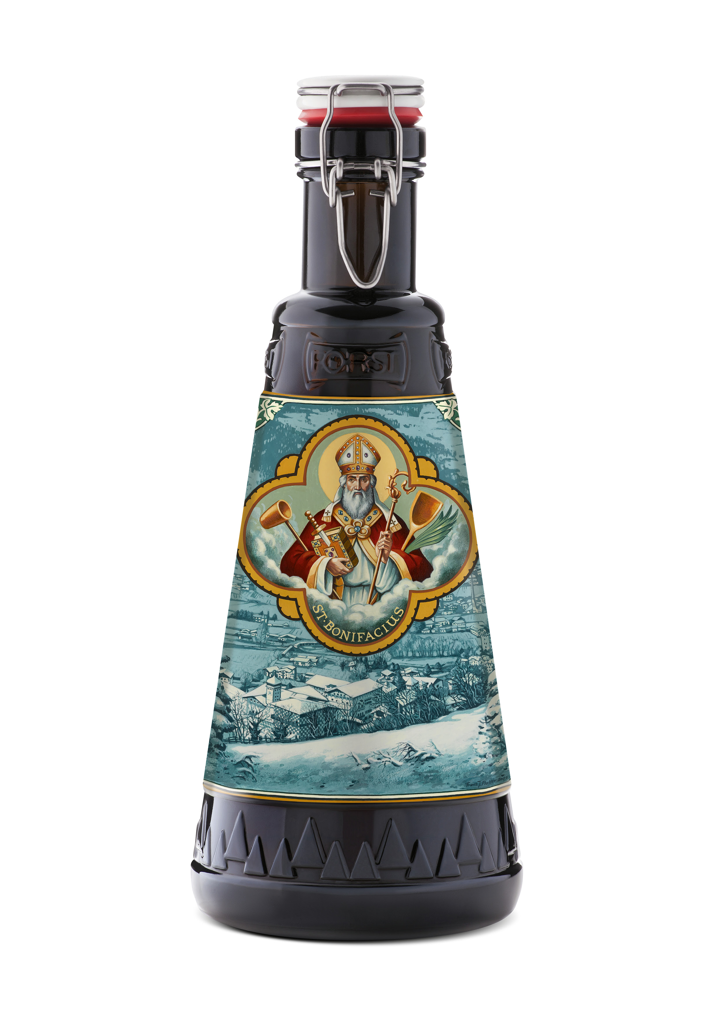 La bottiglia da due litri, in vetro pregiato, diventa così un oggetto da collezione: il decoro, realizzato dall’artista di casa Forst presso “L’Officina” del birrificio, raffigura San Bonifacio avvolto in un mantello rosso vivo, con la Bibbia, la spada, il ramo di palma e gli strumenti dell’arte birraria. Sullo sfondo, una scena invernale con vista dal Monte San Giuseppe, il Castello Forst, la sede principale di Birra Forst e la chiesa di Lagundo, incorniciata da due abeti che evocano l’atmosfera calda e raccolta del Natale.