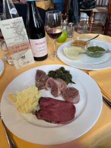 Grande attesa per il carello dei bolliti: gallina padovana, “capeo del prete”, testina di vitello, cotechino, lingua salmistrata con cren, sale grosso, salsa verde e mostarda veneta, purè di patate e verdura cotta ripassata al vapore.