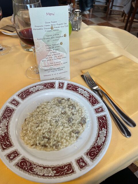 Due primi: tagliolini in brodo ed il risotto Grumolo delle Badesse con i “rovinassi”.