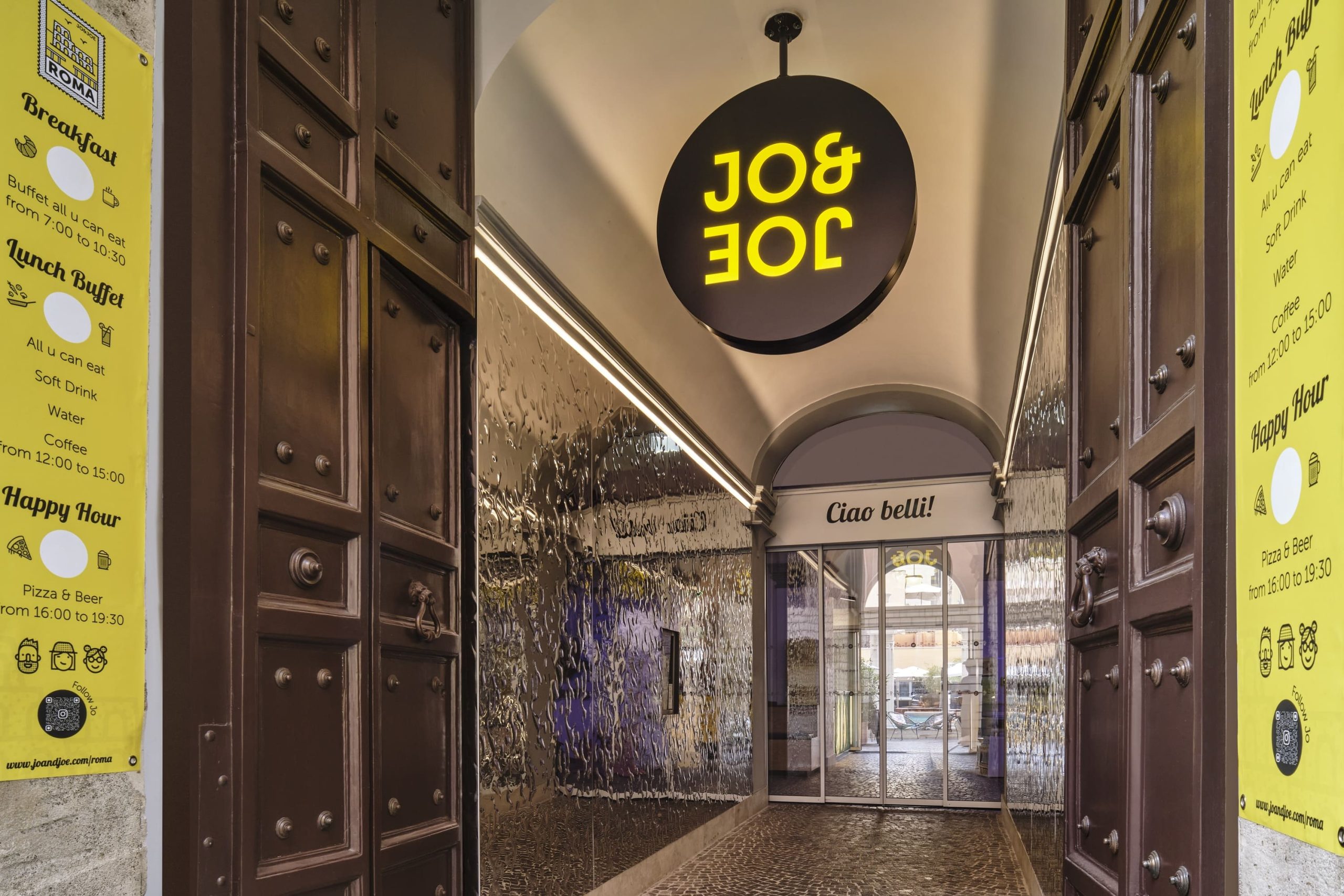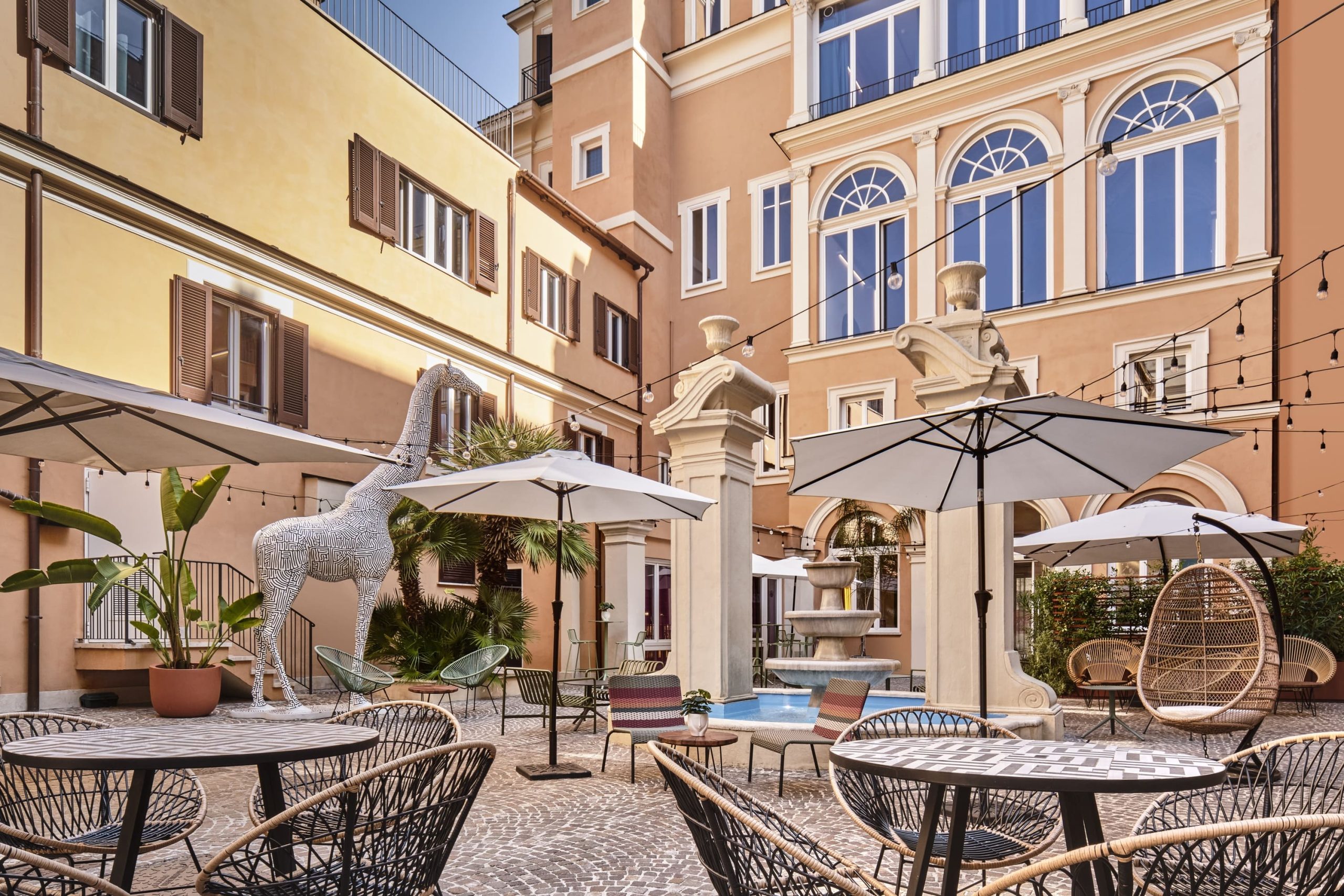 Ospitato in un edificio che fu prima convento e poi hotel, Jo&Joe Roma custodisce un’anima stratificata. Il restauro ha sapientemente preservato scale di marmo, statue e affreschi d’epoca, dialogando con arredi moderni e uno stile pop. Cuore della struttura è il “Secret Garden”, un chiostro interno con una fontana centrale, un’oasi di pace che diventa il palcoscenico perfetto per il brunch e gli eventi. All’interno, il bar si sviluppa tra un’area con divanetti e sedute ideali per un aperitivo o una cena informale e il piano superiore, più raccolto e con tavoli ampi, pensato per chi vuole intrattenersi più a lungo. Con 49 camere (di cui 16 private) tutte con bagno interno, Jo&Joe si propone come un “boutique hostel” per viaggiatori moderni e locali in cerca di uno spazio vivo e accogliente.