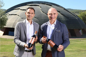 Alessandro Lunelli e l’enologo Luca D’Attoma. davanti al Carapace della Tenuta umbra Castelbuono