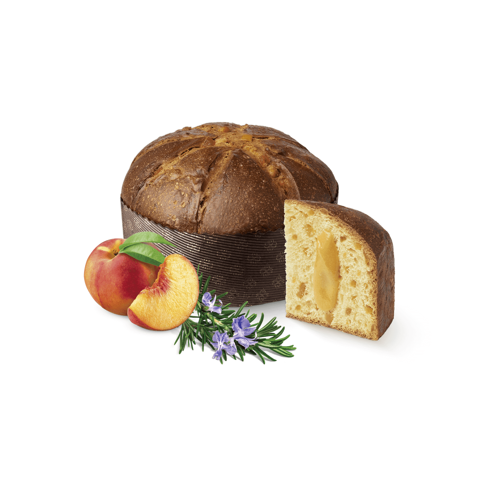 L’impasto soffice è arricchito da pesche semicandite (più tenere e succose dei normali canditi) e delicate note di rosmarino, mentre dopo la cottura viene farcito da una crema alla pesca.
