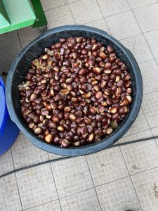 Dopo la raccolta, che può essere realizzata a mano o con mezzi meccanici, i marroni sono tolti dai ricci e inseriti in un contenitore d’acqua per nove giorni durante i quali avviene una leggera fermentazione che fa maturare i frutti (novena).