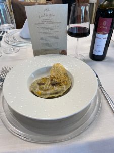 Le carni sono tutte di ottima qualità. Piatto forte e gustoso il tortello rustico di fiore di ricotta con tartufo, castagne, zucca ed essenza di camomilla mantecato con burro di malga e miele di castagno. La pasta del tortello è fatta in casa con impasto di castagne. Sfizioso il secondo; lollipop di anatra farcito con verza e castagna su crema di topinambur e riduzione del suo fondo con gocce di Amarone.