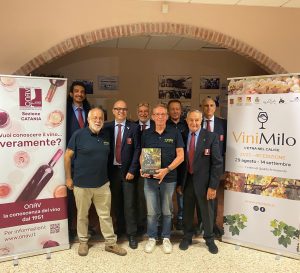 Protagonisti con GRASPO, il sindaco Alfio Cosentino, Danilo Trapanotto ed il gruppo Onav di Catania, Edoardo Ventimiglia e Claudio D’Onofrio dell’Universita’ di Pisa con l’Atlante di parentela genetica dei vitigni italiani.