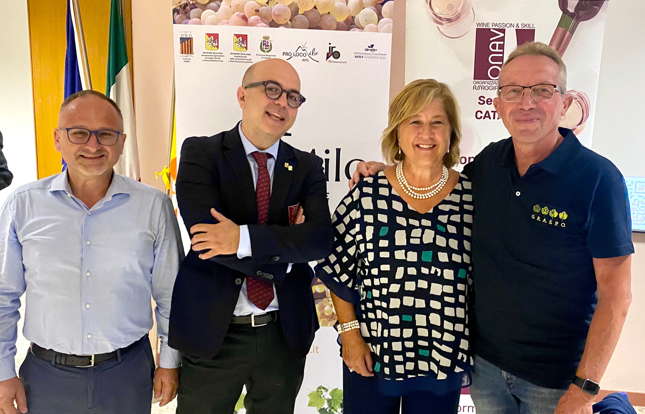Protagonisti con GRASPO, il sindaco Alfio Cosentino, Danilo Trapanotto ed il gruppo Onav di Catania, Edoardo Ventimiglia e Claudio D’Onofrio dell’Universita’ di Pisa con l’Atlante di parentela genetica dei vitigni italiani.
